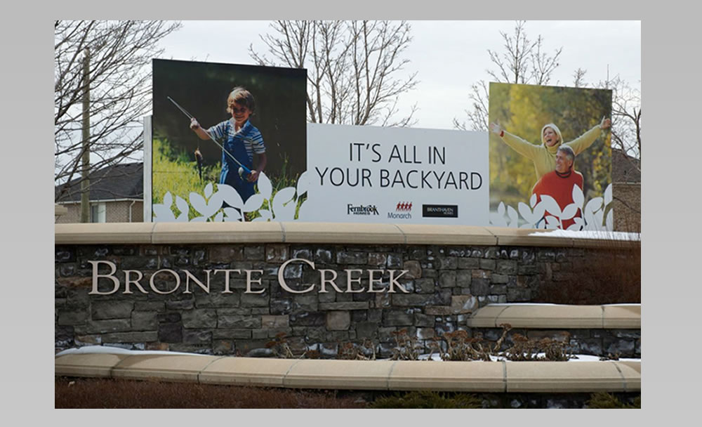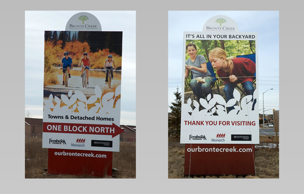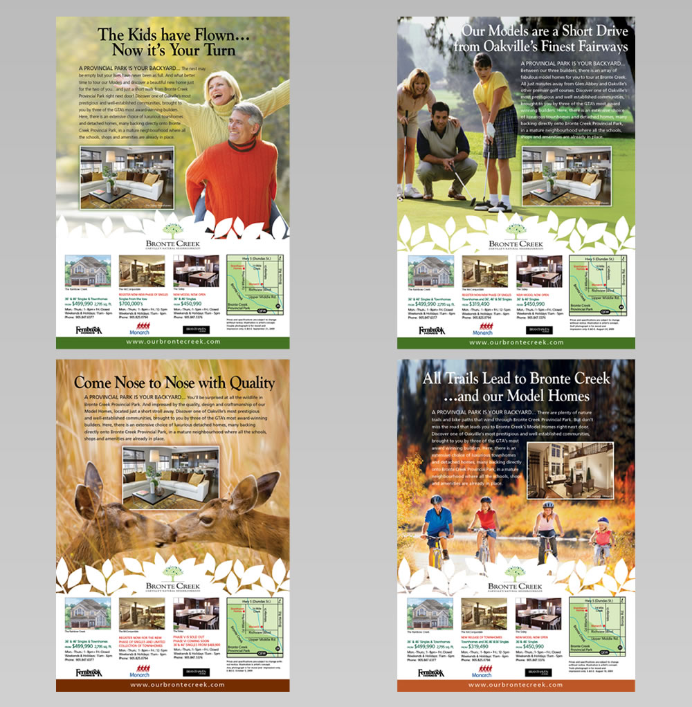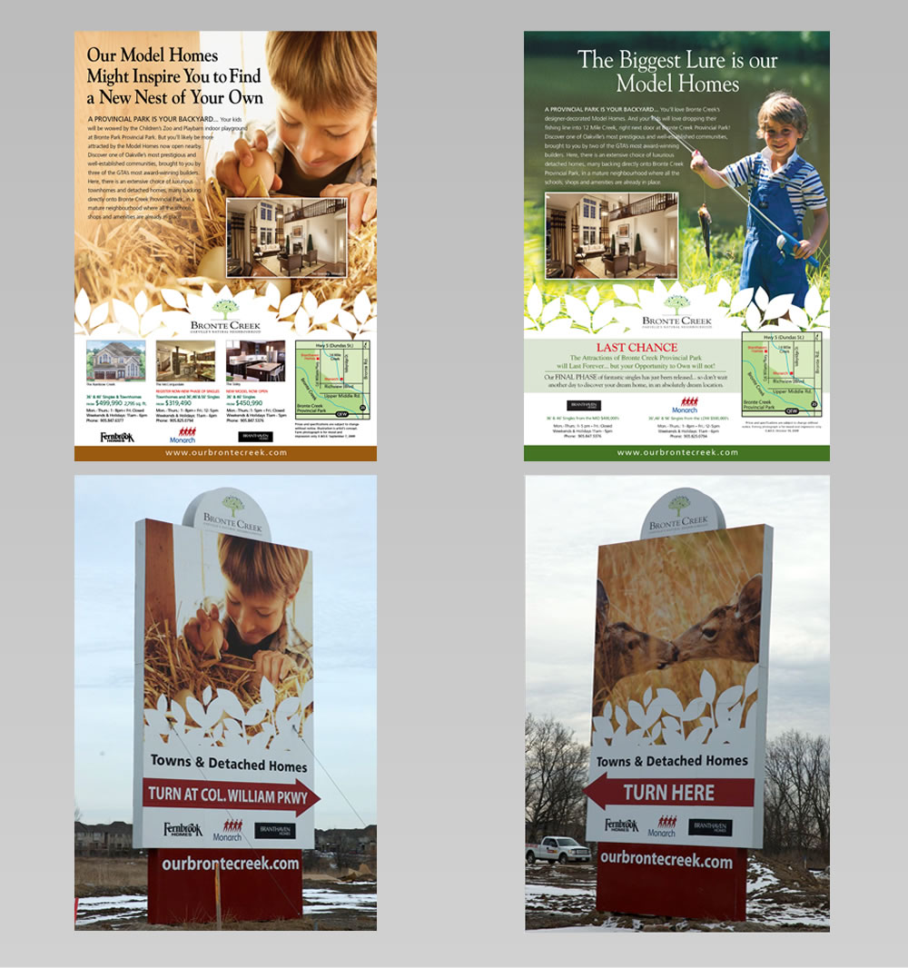 Diezel was retained by three of Canada’s leading builders, with the specific objective to increase and provide better qualify traffic to all the builder’s presentation centres. This was an on-going maintenance service providing themed promotional collateral materials for the community until its sell-out. The site backed onto the Bronte Creek Provincial Park, so the visuals and messages tied into the activities within the park. We identified approximately six activities and consistently rotated these in various media and collateral materials such as signage, direct mail, and regular on-site event marketing.