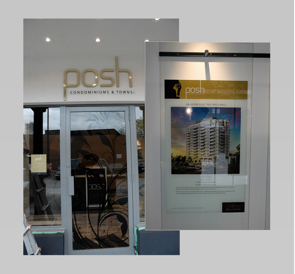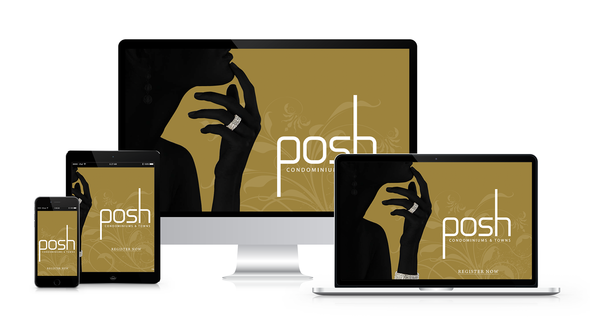 Our task was to create the brand identity and marketing for a luxury high-rise and townhome community in an extremely competitive north Toronto market. The imagery needed to be bold and dramatic and communicate a finer lifestyle. To bring this concept to life we used an elegant silhouette of a lady totally in black, highlighted with diamond encrusted jewelry and reversed out of a background in various gold tones depending on the application. This was highly effective in making the project stand out in a crowded market and captured the spirit of the Posh campaign.